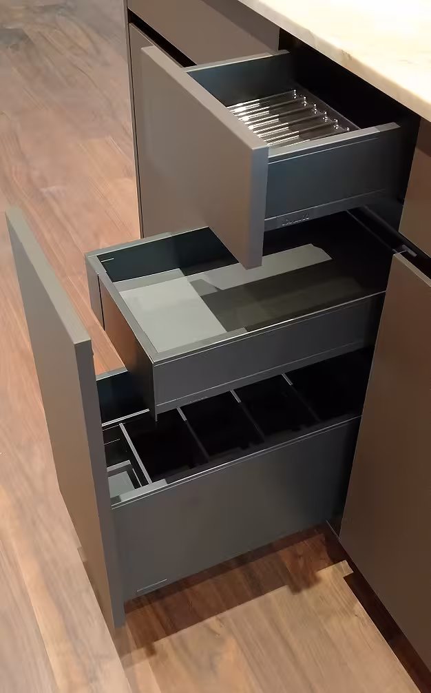Die Architektur des Neubaus findet in dieser maßgeschneiderten Küchenplanung ihre konsequente Fortführung. Durch das Zusammenspiel von dunklen Fronten und warmen Holz-Akzenten entsteht ein Raumgefüge, das Funktionalität mit einer klaren, ästhetischen Formsprache vereint. Jedes Detail wurde präzise auf die räumlichen Gegebenheiten des Privatobjekts abgestimmt.